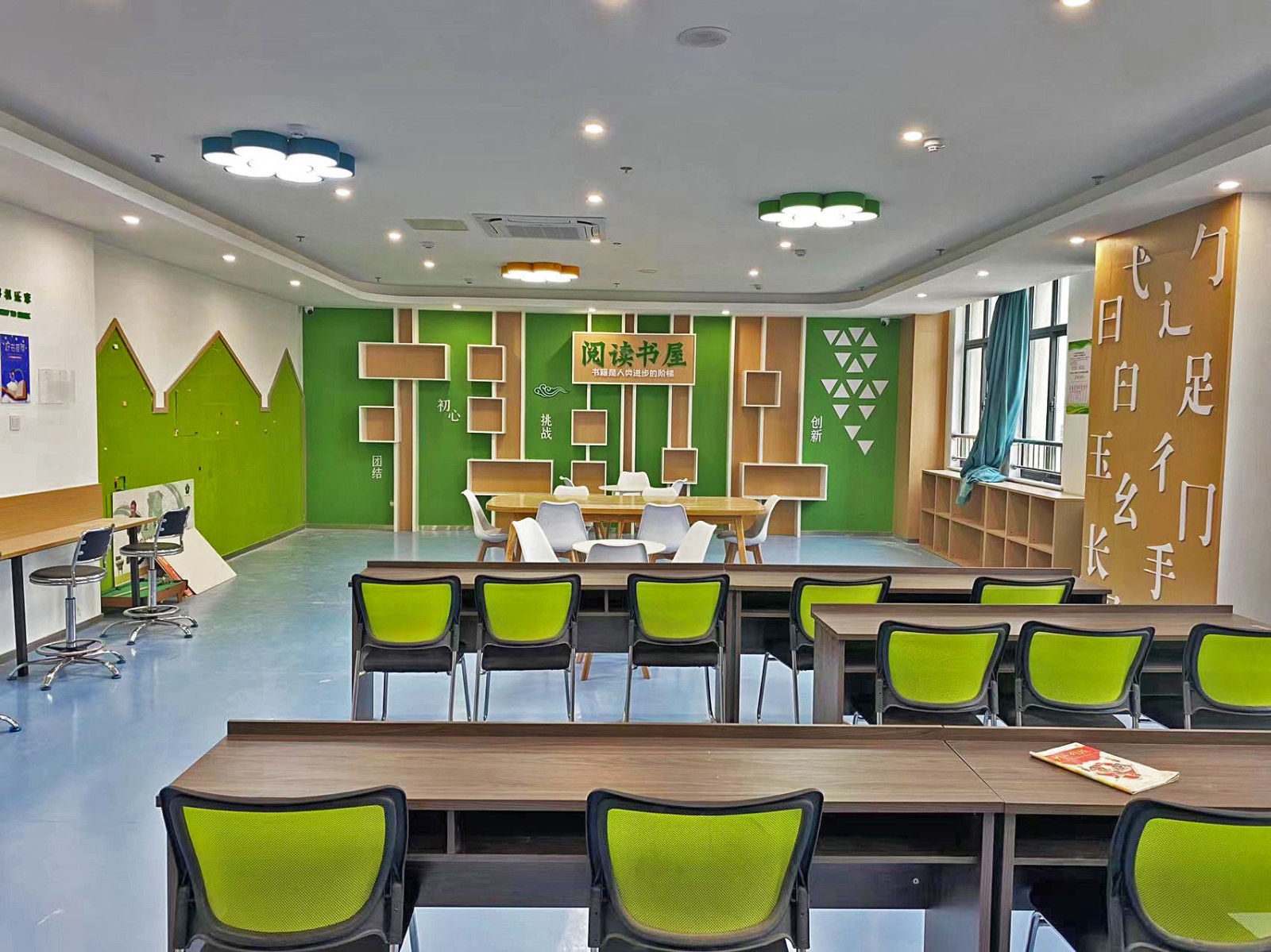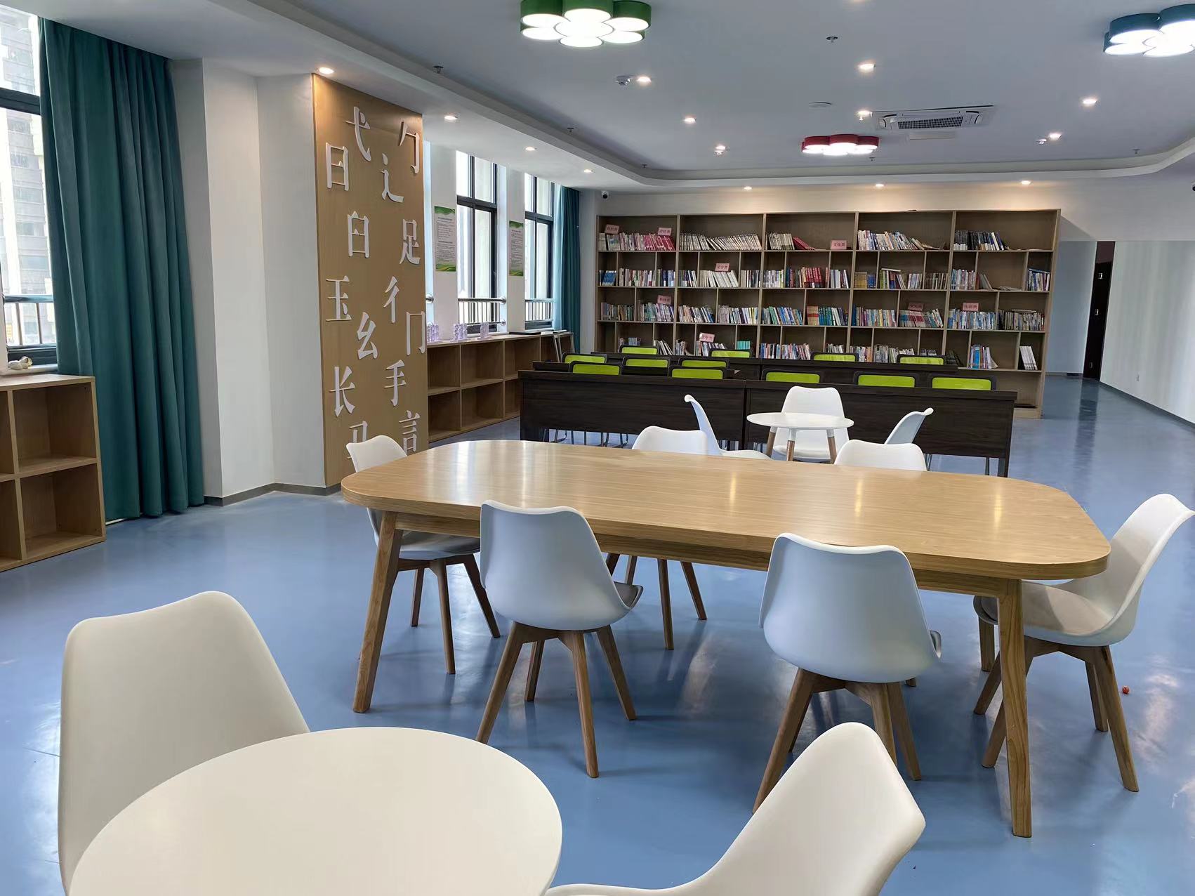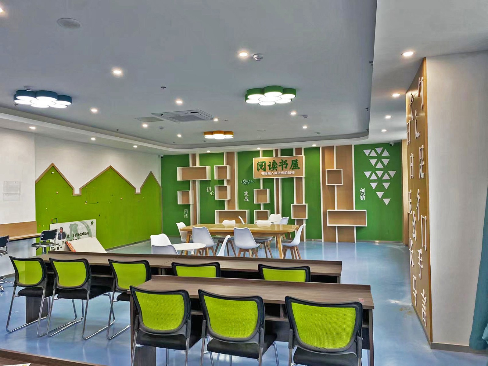 金店社区居民活动中心日期:2023-07-29 在设计之初,阅读书屋便以突出居民阅读功能作用这一点出发,书籍和休闲空间等方面都是展示的重点,而在色彩上面使用绿色更显温馨舒适,材质是多使用木制和绿植以亲民舒适为主。会议室则庄重大气体现党建文化。