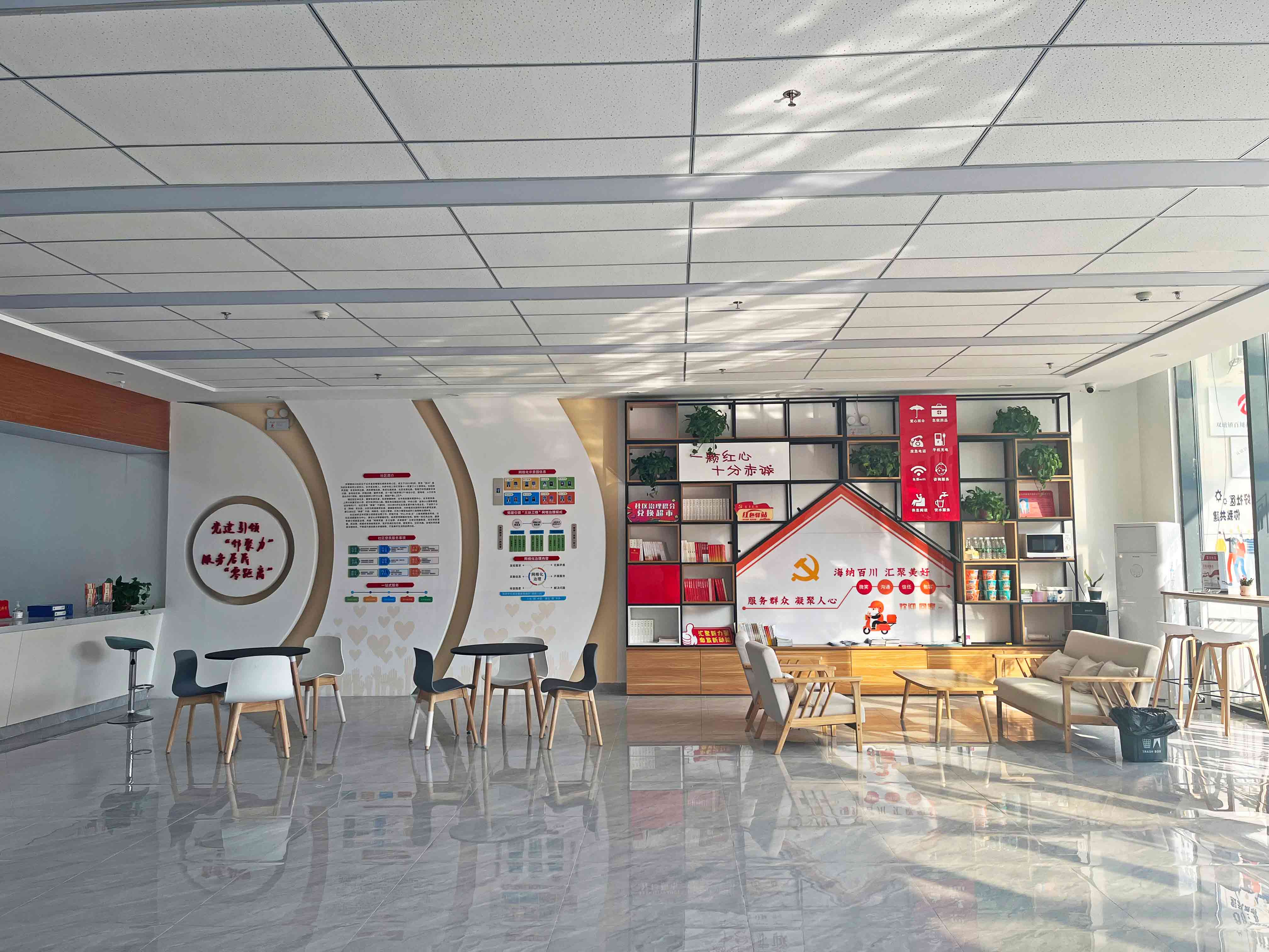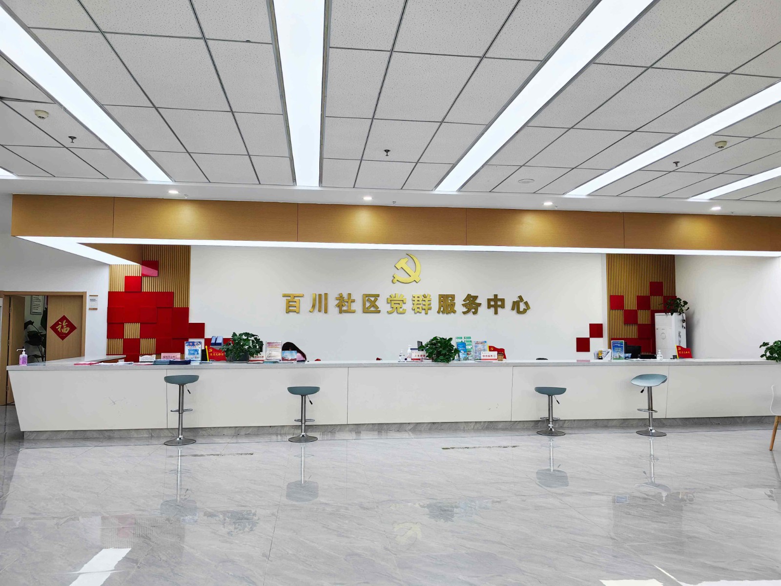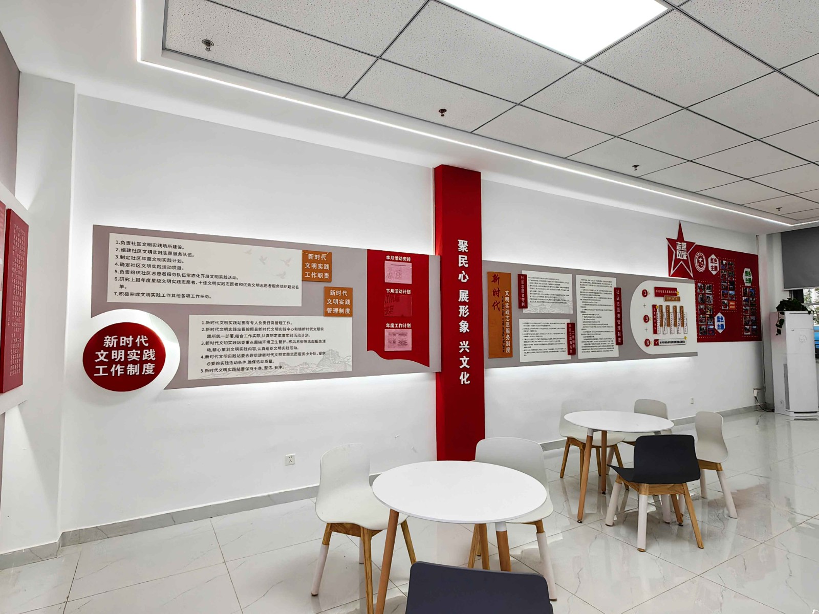 将百川社区党群服务中心建设成为集教育、管理、服务、展示于一体的开放式、多功能、专业化的党建工作综合阵地是此次改造的目标。在设计风格上并没有采用传统的大片的红色,也没有营造庄严的氛围,让人产生距离感,而是在设计过程中将色彩、造型、灯光进行融合,营造亲民、舒适的服务氛围。