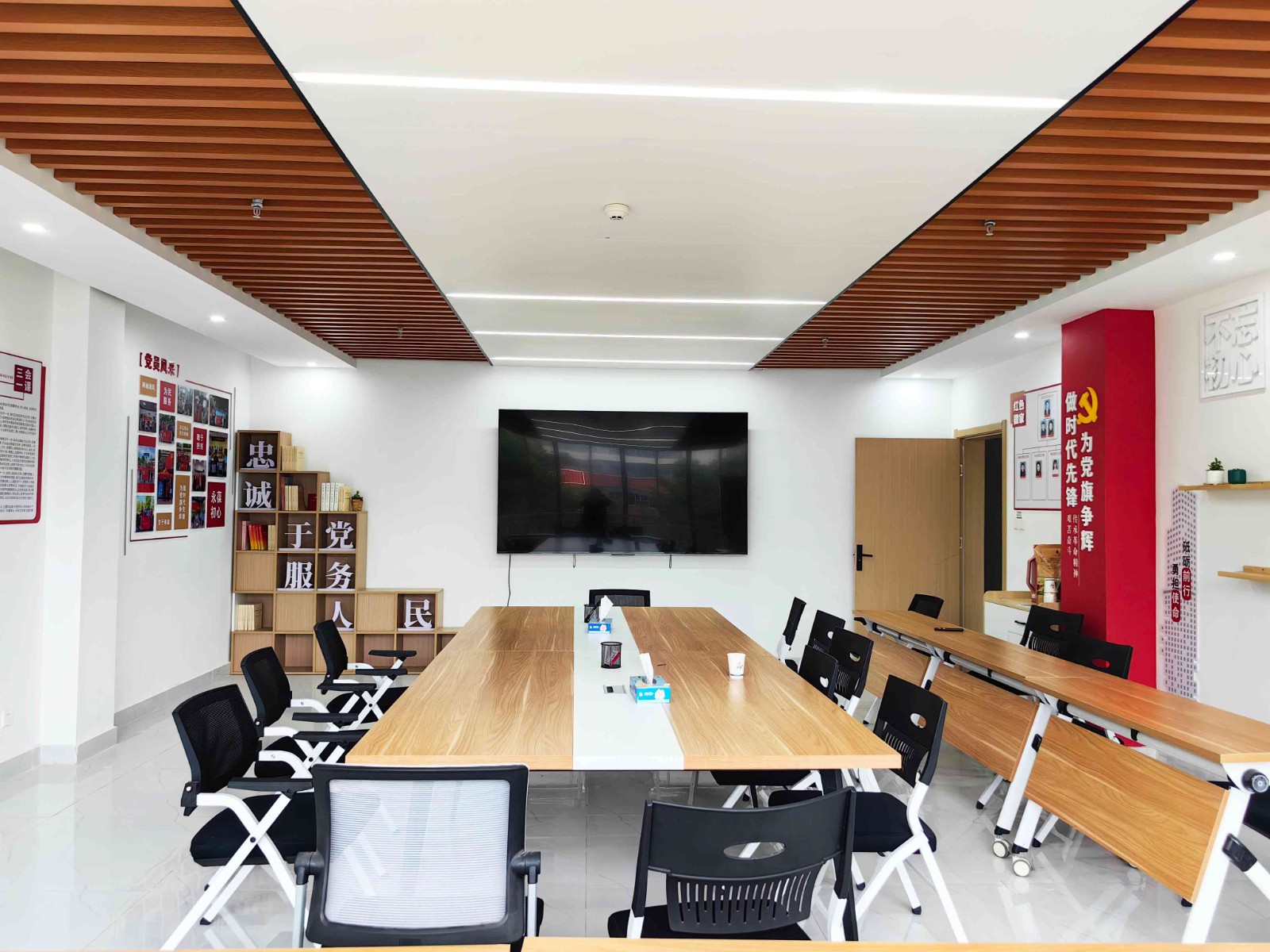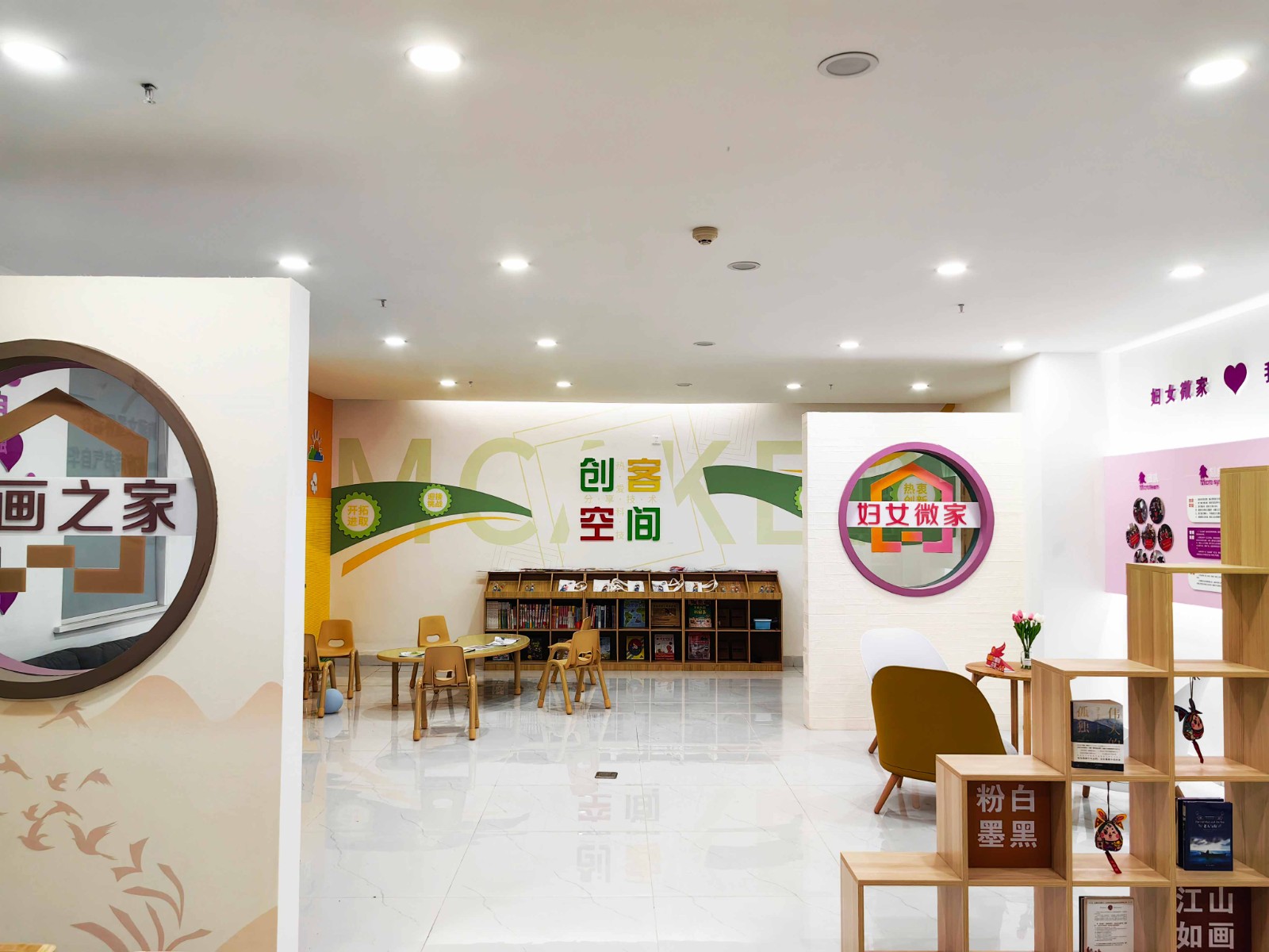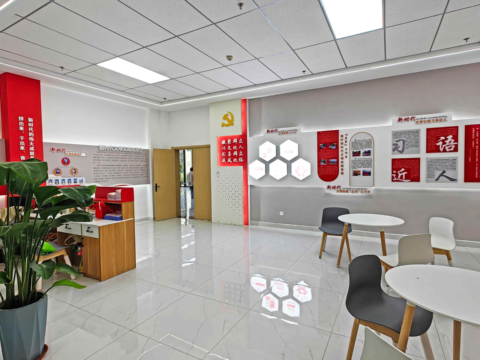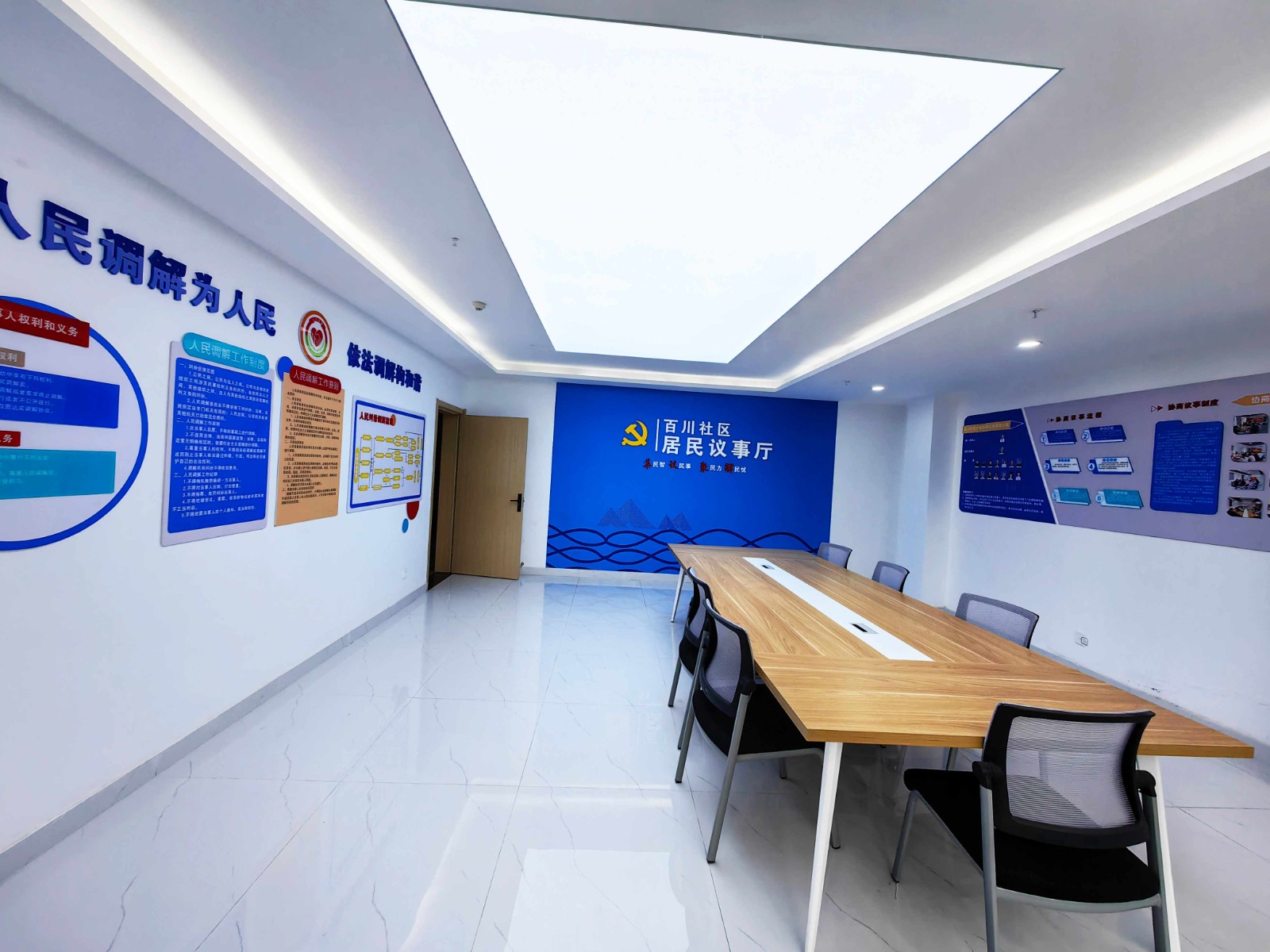 将百川社区党群服务中心建设成为集教育、管理、服务、展示于一体的开放式、多功能、专业化的党建工作综合阵地是此次改造的目标。在设计风格上并没有采用传统的大片的红色,也没有营造庄严的氛围,让人产生距离感,而是在设计过程中将色彩、造型、灯光进行融合,营造亲民、舒适的服务氛围。